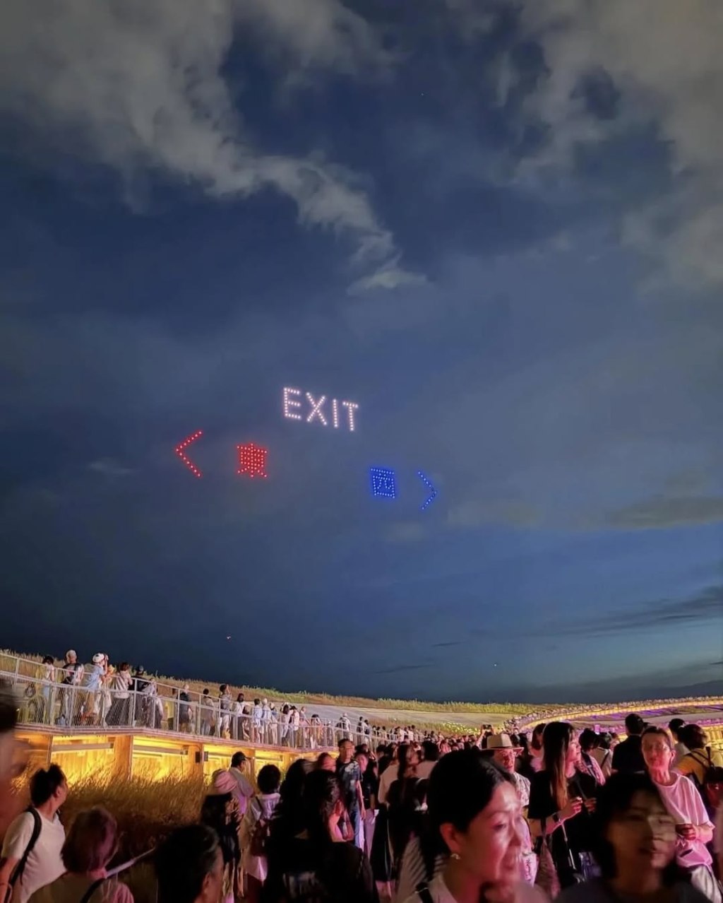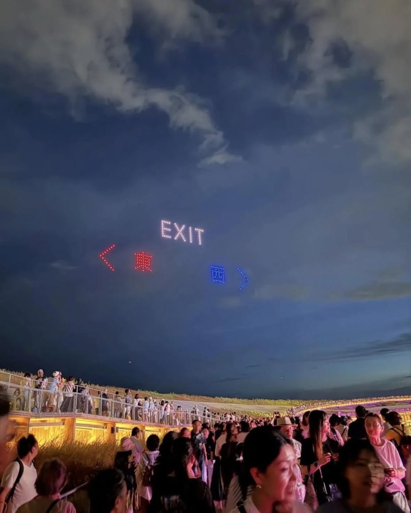 Lors de grands rassemblements, des flottes de drones synchronisés et équipés de lumières LED volent en formation au-dessus du lieu, créant des symboles clairs et lumineux, tels que des flèches ou des panneaux directionnels, qui indiquent aux participants les sorties désignées.